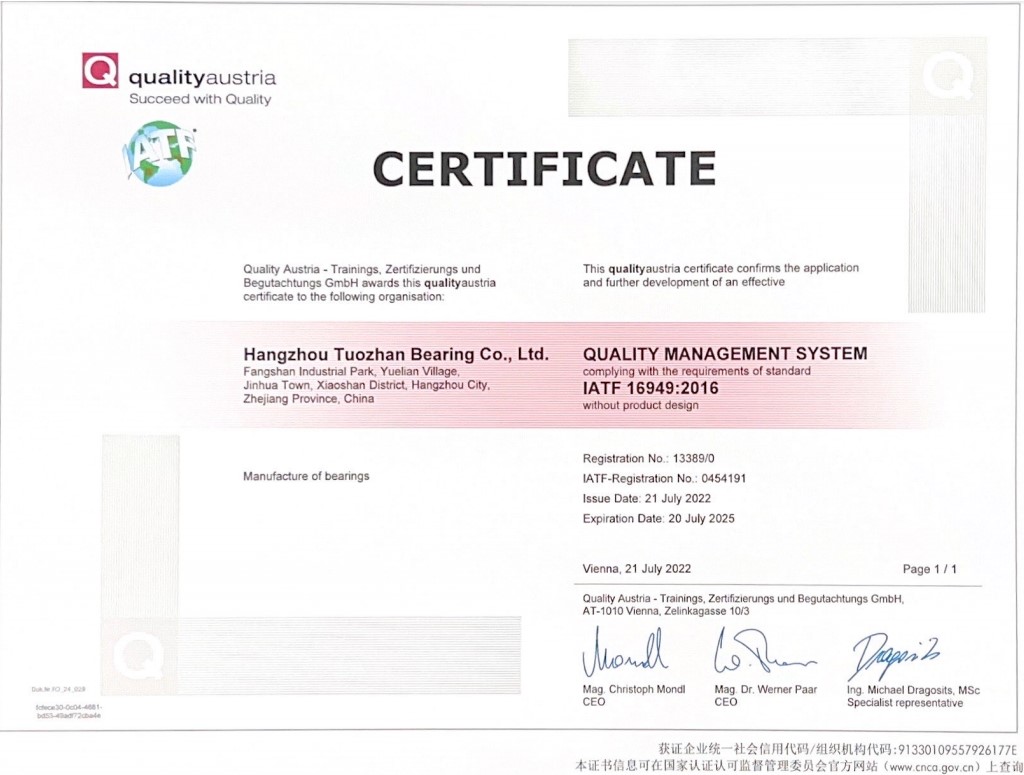 Hangzhou Tuozhan Bearing Co., Ltd. is located in Hangzhou Xiaoshan, on the bank of the beautiful West Lake. The company was established in August 2010. The company has a group of technical and technological talents with middle and senior professional titles, a high-quality management team, and a modern production management concept. After more than ten years of development, it has developed from a little-known automobile bearing manufacturer to a modern high-tech enterprise with a certain scale. The company specializes in the production of automobile wheel hub bearings, mainly producing first-generation wheel hub bearings (double-row angular contact ball bearings, double-row tapered roller bearings), second-generation and third-generation automobile wheel hub unit assemblies. The company has a modern factory building of 11,000 square meters, a professional production line, and uses advanced CNC production equipment and high-precision testing instruments, as well as ERP and MES digital management systems. The products are strictly designed and manufactured in accordance with the IATF16949 quality management system standards. The company has now developed and produced more than 1,000 types of automobile wheel hub bearings to meet the needs of domestic and foreign supporting and after-sales markets.